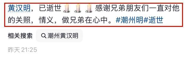 “黄汉明,已逝世,感谢兄弟朋友们一直对他的关照,情义,做兄弟在心中。”