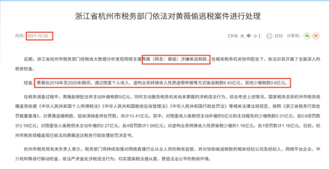 先看名气最大的:直播带货一姐薇娅。2021年,杭州税务部门查实,她在2019年到2020年间偷逃税款6.43亿元,加上罚款和滞纳金,总计13.41亿元。