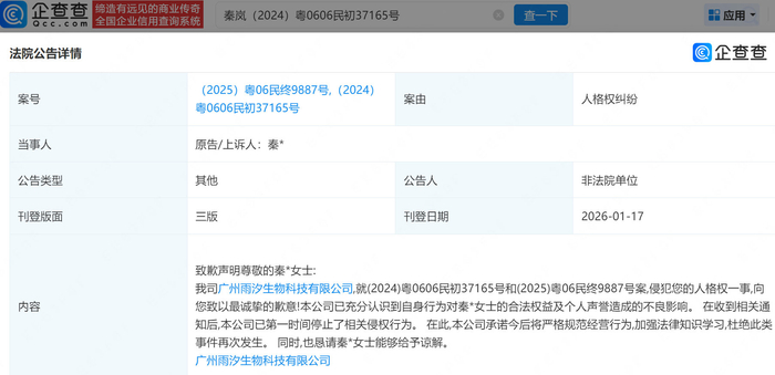 企查查APP显示,今年秦岚已起诉多方侵权,案由包括网络侵权责任纠纷、人格权纠纷。今年2月,法院公告其与广州南嘉医药生物科技有限公司、广东上影蓝鲸影视文化传媒有限公司网络侵权责任纠纷一案民事判决书,两被告被判公开道歉并赔偿秦岚赔偿经济损失8万元,判决生效后,被告拒不道歉,秦岚申请强制执行。此前,广州雨汐生物也曾因侵犯秦岚人格权公开致歉。