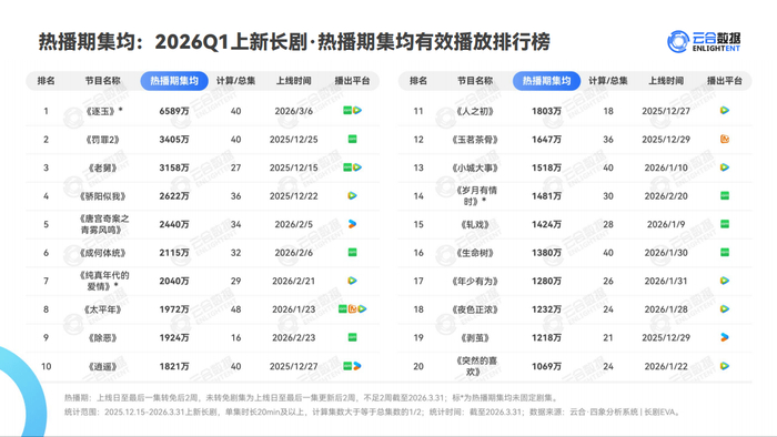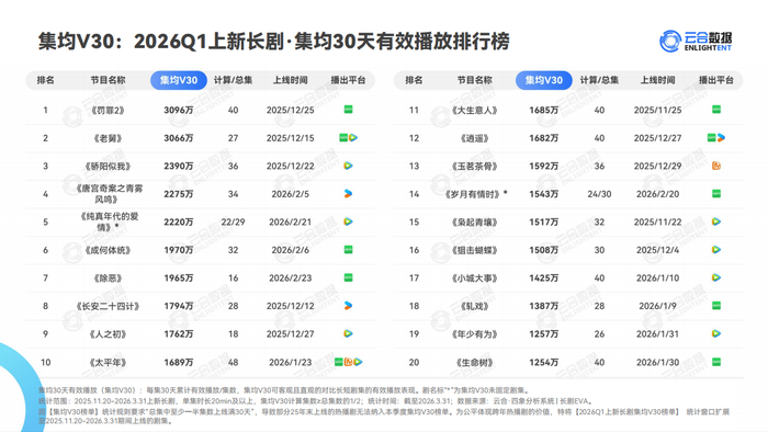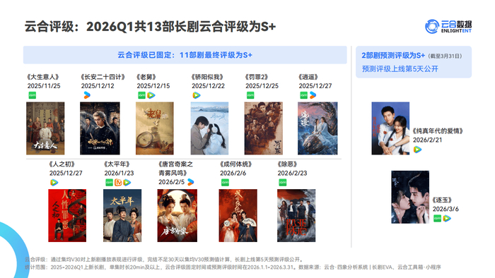 紧随其后的是刑侦剧《羽罪2》,累计有效播放超10亿,集均V30与热播期集均均超3000万,日冠天数达22天。《太平年》《老舅》《骄阳似我》等剧同样跻身全网累计与集均榜单前列。整体来看,2026Q1共有13部长剧获云合S+评级,其中《大生意人》《长安二十四计》《老舅》《人之初》等11部最终评级锁定S+,《纯真年代的爱情》《逐玉》为预测评级S+。