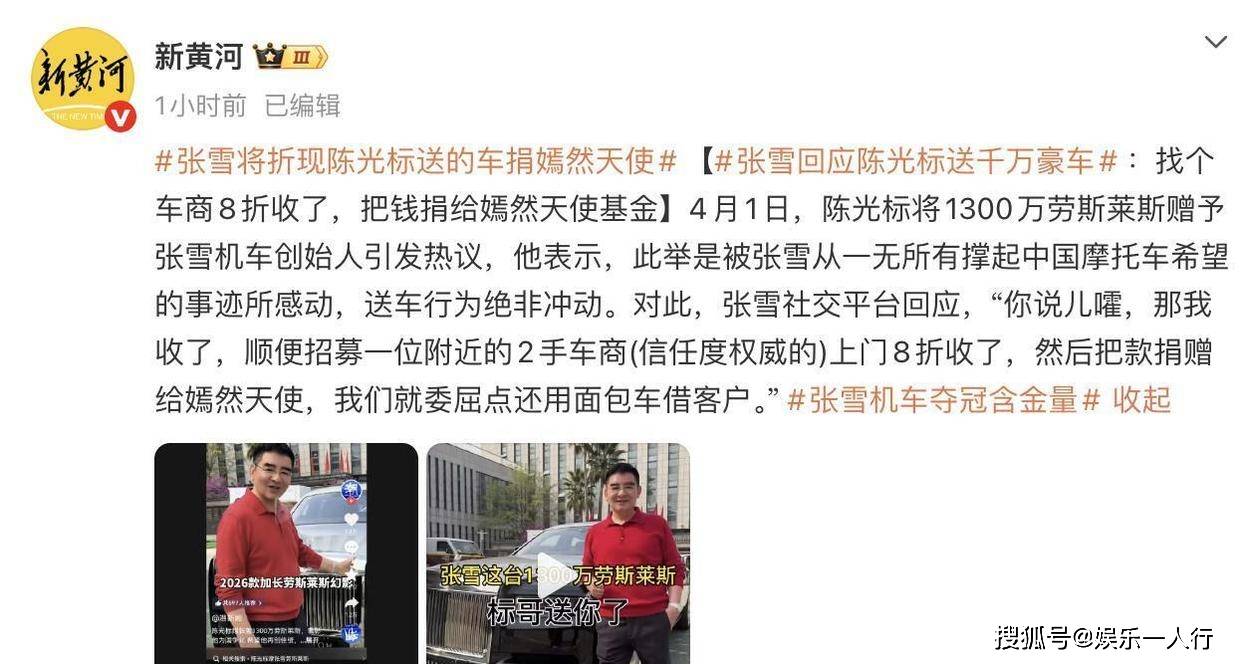 陈光标的剧本其实很清晰。4月1日,他在视频里情绪饱满,称张雪带着中国机车在世界顶级赛场WSBK连续夺冠,打破了国外几十年的垄断,是“中国的英雄”。为了表彰这份荣耀,他决定将公司刚购买的、“中国唯一一辆”2026款加长劳斯莱斯幻影,市场价1300万,赠予张雪“个人使用”,作为“接待用车”。视频点赞超过22万,评论3万多条,流量瞬间拉满。这套操作对陈光标来说驾轻就熟:高调宣布、制造话题、受赠者感恩、媒体传播、个人品牌强化,形成一个完美的流量闭环。他试图复刻过去“现金墙”、“街头发钱”的模式,用极具视觉冲击力和话题性的方式,完成一次“仪式化慈善”的表演。