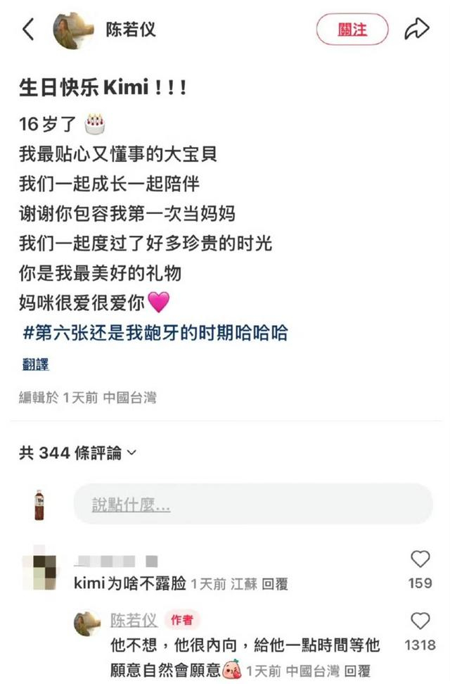 去年,Kimi过16岁生日,陈若仪在评论区回应儿子不露脸的原因,原来是因为他自己不喜欢面对镜头。
