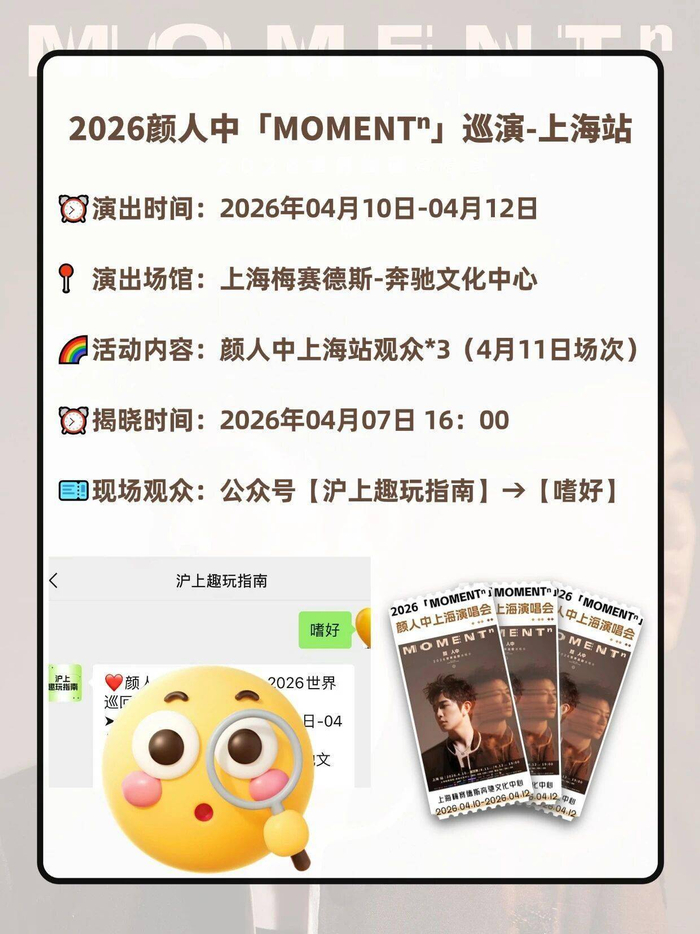 2026年4月10日至12日,颜人中「MOMENTⁿ」巡演在上海梅赛德斯-奔驰文化中心盛大开幕!这场演出不仅是对经典经典的致敬,更是对观众沉浸式视听体验的全方位重构,作为一场充满年轻气象与创新精神的音乐盛宴,「MOMENTⁿ」以其震撼的视听效果和深情的音乐表达,瞬间点燃了现场观众的热情。,演出场地的选择极具辨识度,梅赛德斯-奔驰文化中心的无边界大厅、可变式舞台以及先进的音视频设备,为演出提供了无限可能,舞台设计融合了未来感与经典美学,光影交错、线条流动,宛如一场艺术品在不断变换姿态,观众席的布局也十分人性化,无论是地上座位还是平地席位,都为每位观众带来了最佳的视线和感受。,从开场的第一秒起,颜人中带来的音乐风格便展现了极强的辨识度,他们将经典旋律与现代电子元素完美融合,打造出独具特色的音乐语言,舞台灯光与每首歌曲的节奏完美契合,烟雾、激光、水幕等特效一波波展开,仿佛将观众带入了一个数字化的音乐世界,尤其是在演出中多次使用的“光影穿梭”特效,既有视觉冲击力,又为音乐表达增添了层层次次的深度。,演唱表现更是令人惊叹,颜人中的每位成员都展现了极强的音乐才华,无论是带喉的演唱还是舞台表现力,都让人惊艳,特别是在一些高难度的调色段,他们的发声控制和节奏感令人叹为观止,演出中多次出现的“无伴奏舞台”环节,更是让观众直观感受到他们的音乐实力和舞台魅力。,除了音乐表演本身,演出的另一个亮点是对经典元素的重新诠释,许多观众表示,虽然是对经典的致敬,但颜人中用自己的方式重新演绎,使经典焕发了新的生机与活力,尤其是在演出中多次重现的经典曲目,其编曲、演唱与原作相比,既保留了原有的情感内核,又加入了更多现代元素,使观众耳目一新。,观众的反应也非常热烈,从开场的热情欢呼,到演出中多次高潮的雷鸣喝彩,每一刻都充满了感染力,特别是在演出最后的ending曲“MOMENTⁿ”,观众的集体合唱与舞台的精彩配合,让整个场馆充满了澎湃的能量,很多人表示,这场演出不仅是一次音乐盛宴,更是一次情感的共鸣与心灵的震撼。,颜人中「MOMENTⁿ」巡演上海站是一场充满感染力的音乐盛宴,它不仅延续了经典的音乐精神,更通过现代的舞台技术与创新表演,将音乐与观众的感官体验达到了新的高度,无论是音乐爱好者还是普通观众,都能在这场演出中找到属于自己的精彩瞬间,如果你还没有看过这场演出,那么你真的错过了什么呢!