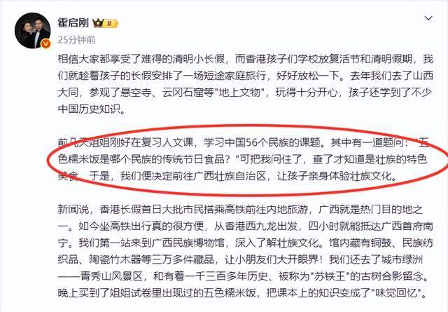 **霍启刚太“任性”!因女儿问题选择游广西,郭晶晶的工地腰包亮了**,霍启刚在社交媒体上分享了一段关于一家五口去广西游玩的画面,瞬间点燃了网友的热议,从画面中可以看出,霍启刚对孩子的教育方式完全是“任性”的风格,完全不在乎社会的眼光和传统的教育方式。,女儿在复习人文课时,竟然遇到了一个难以逾越的民族文化题目:五色糯米饭是哪个民族的传统节日食品,这个问题把霍启刚难住了,随后他赶紧查询资料,得知这是壮族的特色美食,这一幕让人不禁感慨万分,原来教育孩子真的需要这样的“深度”和“广度”,普通人是没有这个觉悟的。,而当天一家五口去了很多地方,学到了很多知识,这也是霍启刚“任性”的原因之一,可以说,这家夫妻的教育理念完全不一样于普通人,他们愿意花费大量时间和精力去陪伴孩子,甚至带他们去游玩学习。,郭晶晶的表现更是让人印象深刻,她穿着简单又透着素雅的碎花长裙,搭配黑色秀发,整个人透着优雅与知性,最有看点的是她的腰包,那不是普通的包,而是工地上的腰包,看来不仅农民工兄弟带,连郭晶晶这样的豪门媳妇也很喜欢这类实用又时尚的单品。,玩漂流的时候,郭晶晶的紧张可以看出来,可能是因为很久没接触“跳水”了,不过大儿子霍中曦玩得兴致勃勃,脸上挂着灿烂的笑容,气氛轻松又温馨,对于霍启刚来说,大女儿是他最喜欢的“贴心小棉袄”,由于大女儿对当地的一些民俗不太了解,身高也不是很够,霍启刚直接把她抱了起来,画面非常温暖。,关于教育孩子,郭晶晶早在之前就曾在媒体面前讲述了很多细节,包括夫妻两人产生分歧的时候到底该怎么办,关于这方面,相信很多家长都会遇到,但很少有人能够做到他们这样统一,毕竟,前往广西游玩需要耗费两个人精力,一旦有一人感觉不合适,那中间就会吵架。,郭晶晶原话是这样说的:“你有你的道理,我有我的道理,那我们怎么样子去把事情去解决?日子还是得过嘛!”这句话道出了很多家庭的共鸣,养育孩子不是简单的供应吃喝玩乐,而是让其养成一个好的习惯,让其看到这个世界的美好,一些事情也不要阻拦,但需要引导。,霍启刚和郭晶晶这对夫妻的教育理念和家庭氛围,真的让人感叹有多么独特和特别,他们用自己的方式陪伴孩子成长,也用自己的方式经营着这段幸福的家庭,无论是教育孩子,还是生活中的点点滴滴,他们都是毫无保留地投入在内,这才是真正的“任性”吧!
