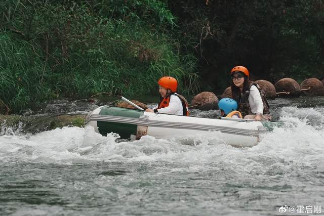可能是长时间没有接触“跳水”的缘故,玩漂流的时候,明显能够感觉出郭晶晶的紧张,不过大儿子霍中曦玩得不亦乐乎,脸上的笑容就没有断过。