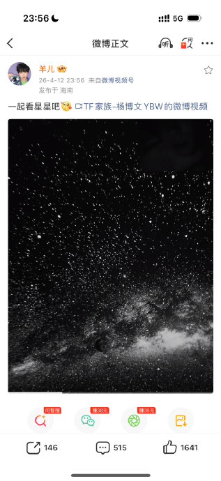 2026年4月12日凌晨3点16分,杨博文在剧组酒店失眠时,用几十元的星空灯将天花板投射成银河,并翻转手机镜头拍摄第一视角视频。他轻声说“一起看星星吧”,同时模拟躺在草地上的晃动视角,询问粉丝“是不是晃得有点晕”,语气温柔带笑。视频精确到秒的时间戳(3:16:55)被粉丝视为“专属宇宙的暗号”。