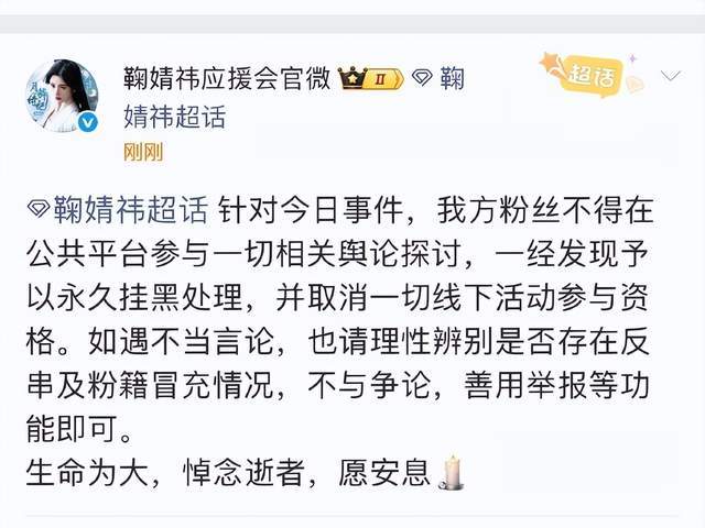 鞠婧祎这边呢?粉丝应援会的声明堪称教科书。"生命为大,悼念逝者,愿安息。" 十二个字,极致清醒,极致克制。不消费死亡,不煽动情绪。这份体面,在乌烟瘴气的饭圈里,简直像一股清流。