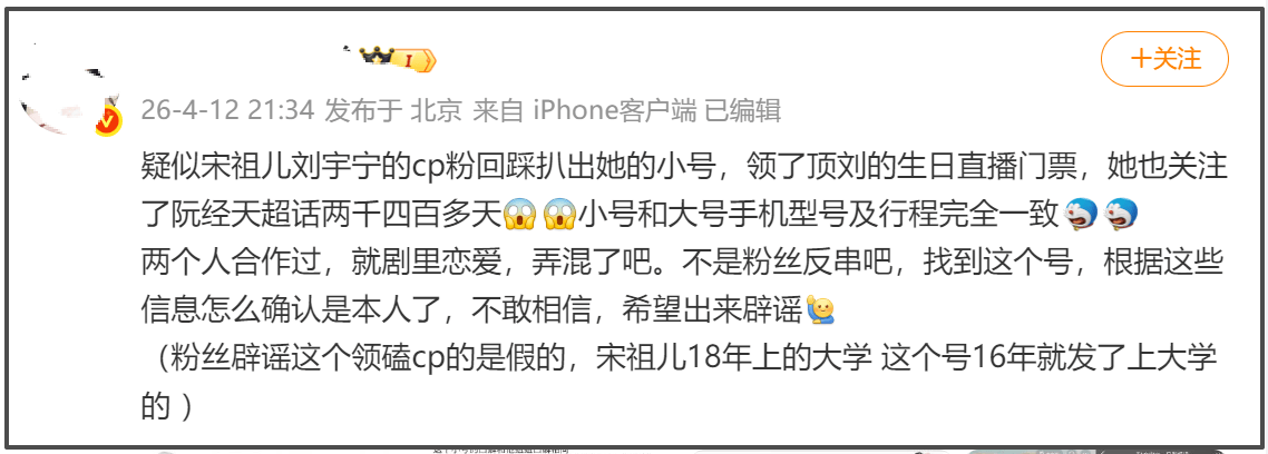 疑似小号还关注了宋祖儿大粉,同款博、物料汇总博,甚至该小号被指绑定的手机号实名信息与宋祖儿关联(她本名孙凡清)。OMG!