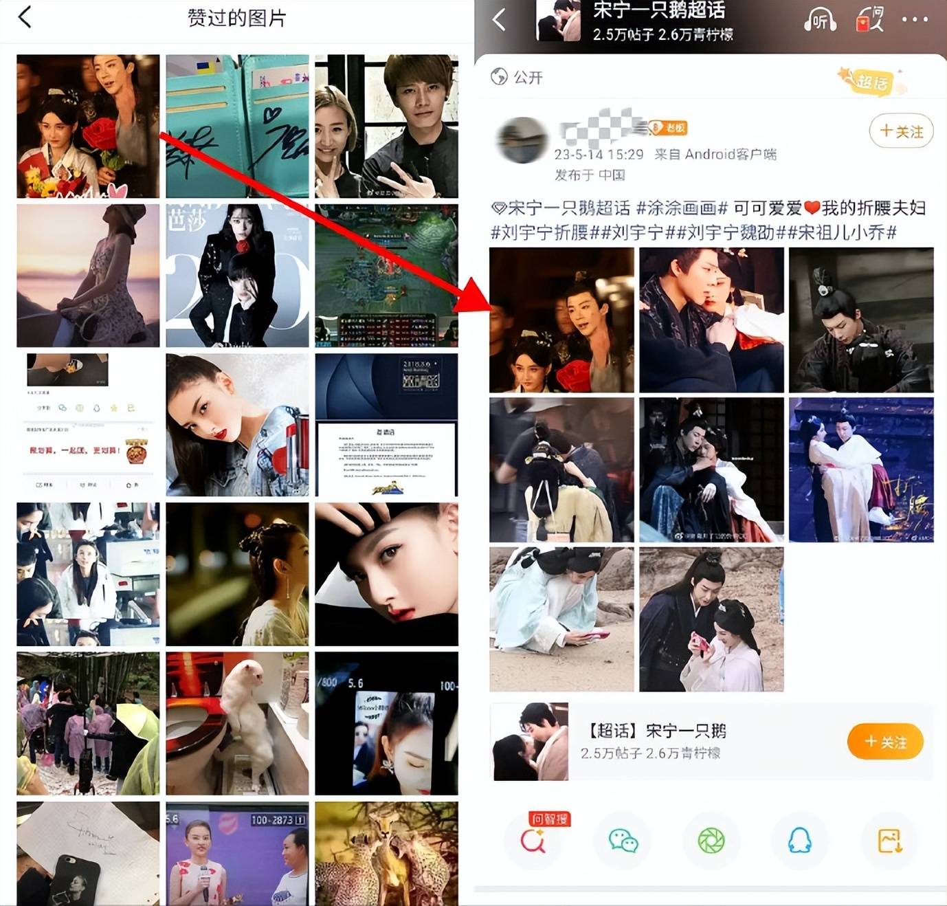不仅如此,该疑似小号除了大量点赞宋祖儿的内容,还关注两人CP超话“宋宁一只鹅”超1000天,甚至领了刘宇宁生日直播门票,点赞CP相关内容,甚至还点赞过关晓彤鹿晗,王一博基美合、任嘉伦跟老婆的内容,看着好像很磕明星的恋爱。
