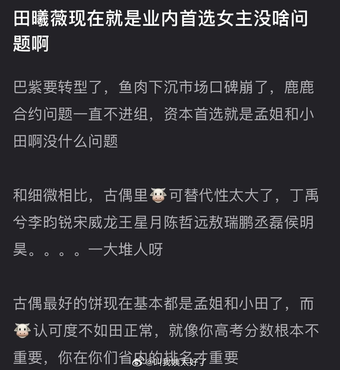 有网友说田曦薇现在就是业内首选女主没问题,巴紫要转型了,鱼肉下沉市场口碑崩了,鹿鹿合约问题一直不进组,资本首选就是孟子义和田曦薇,大家怎么看?
