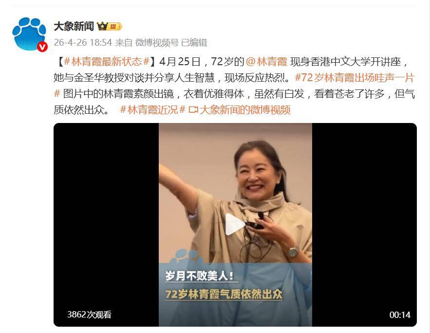 据4月26日报道,4月25日,71岁的林青霞以作家及香港中文大学荣誉院士的身份,现身崇基学院75周年“至善讲座”。活动现场,她与翻译学家金圣华教授对谈,分享人生智慧,主题为“一程一景色,处处好风光”。这场讲座吸引了近3000名师生及公众参与,座无虚席,可谓近期她最受关注的公开活动。