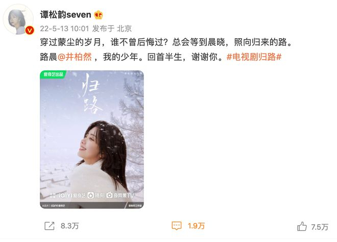 仔细一看,才发现原来是电视剧《归路》的官宣文案,对此网友的反应也是各不相同,有人期待开播,有人觉得毁了小说,还有人认为井柏然谭松韵归路雪地氛围感大片CP感爆表。