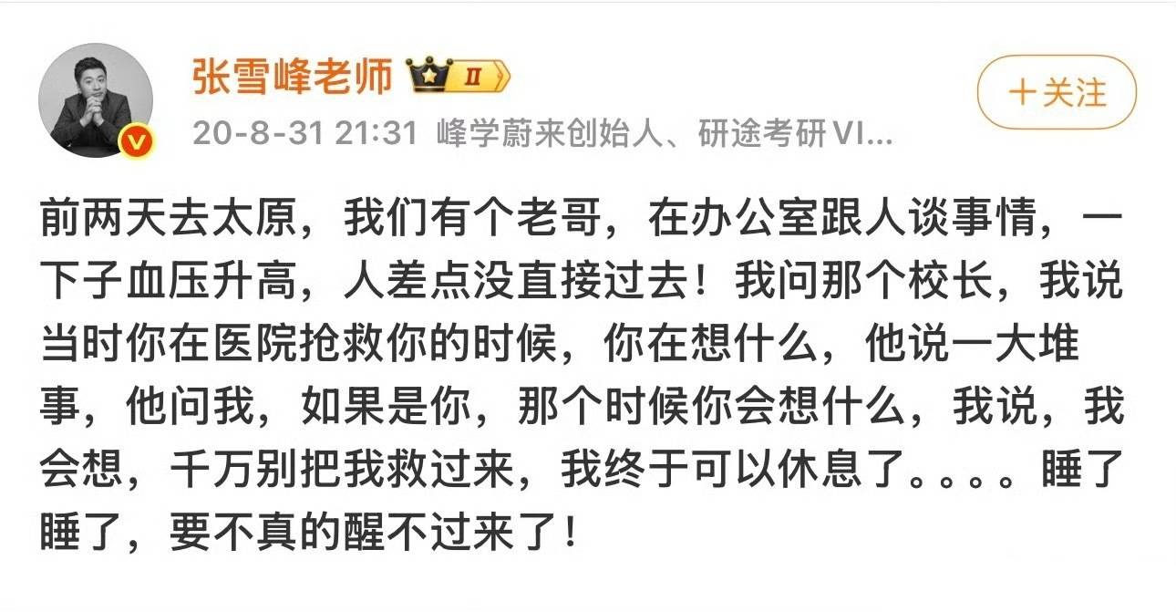 其实张雪峰早就知道自己的身体情况了,只可惜啊,被公司业绩绑着,被员工绑着,想停下来都没办法,也不知道张雪峰自己后悔不后悔呢