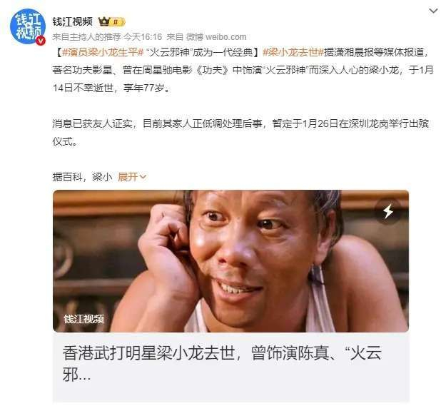 据潇湘晨报等媒体报道,著名功夫影星梁小龙于1月14日不幸逝世,享年77岁。梁小龙以其在周星驰电影《功夫》中的“火云邪神”一角,深深刻入了观众的心中。消息传出后,友人证实了这一不幸消息,目前梁小龙的家人正在低调处理后事,预计将于1月26日在深圳龙岗举行出殡仪式。梁小龙,1948年4月28日出生于广东省中山市,成长为中国香港的演员、武术家及武术指导。他在2004年出演了周星驰的电影《功夫》,其中饰演的“火云邪神”,以其独特的蛤蟆功和犀利的眼神,成为观众心中不可磨灭的经典形象。