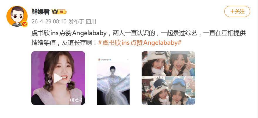 ## 虞书欣点赞Angelababy:一段关于"真社交"的吃瓜,在这个信息爆炸的时代,名人之间的一举一动都被放大、解读、评价,4月29日,这个看似平平无奇的点赞,却让不少网友直呼“磕到了”,这就是虚书欣在Instagram上点赞Angelababy的“惊天大新闻”,话题“虞书欣ins点赞angelababy”迅速发酵,引发全网围观。,这条点赞背后,是两位实力派演员之间的真实互动,Angelababy发了一组环保主题的时尚大片,画面聚焦造型美学与环保理念,格调拉满,虞书欣这一指头下去,直接把自己送上了热搜,乍一看,这不过是一次普通的社交互动,却在粉丝和路人眼里,这信息量可就大了。,多数网友的第一反应是:"这就是‘美女间的双向欣赏’啊。"没有商业互吹的刻意,也没有蹭热度的嫌疑,纯粹是审美共鸣加私下关系好,才敢这么大大方方地点下去。,如果你以为这只是"塑料姐妹花"的客套,那就太小看这两位的交情了,时间线往回拉,两人的缘分早在2022年就埋下了伏笔,那年,她们一起录制了综艺《超有趣滑雪大会》,节目中,Angelababy对虞书欣那叫一个照顾,被粉丝形容为"当孩子宠",而虞书欣也毫不掩饰对这位姐姐的欣赏,公开夸对方"漂亮温柔、胆子大",到了2022年8月,Angelababy更是主动为虞书欣主演的爆款剧《苍兰诀》宣传,这波操作直接印证了两人长期以来的友好互动,绝非表面功夫。,所以这次点赞,更像是老朋友之间的日常支持,没什么大惊小怪的,更让人欣慰的是,这次事件没撕起来,虞书欣的粉丝(小石榴)翻出旧账,提到她早年就把Angelababy视为"特别喜欢的姐姐",这份初心一直没变,而Angelababy的粉丝也相当大度,回应道:"两位都很好,不爱请别伤害。"双方粉丝不仅没互掐,反而联手维护了一波"和平追星"的氛围,这在动不动就开战的粉圈生态里,属实难得。,说到底,在一个人人都在计算"点赞会不会被骂"、"互动会不会被蹭"的娱乐圈,虞书欣这一指头,反而显得有点"活人味儿",没有剧本,没有公关话术,就是一个年轻女演员对自己欣赏的前辈,发自内心地点了个赞。,而这份"美女间的双向欣赏",或许才是内娱最该被看到的"真·社交"。
