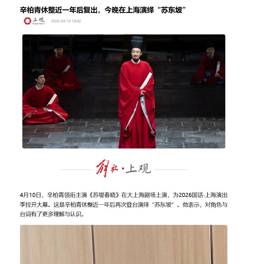 而随着辛柏青现身消息一同传来的是他正式复工出演话剧《苏堤春晓》。