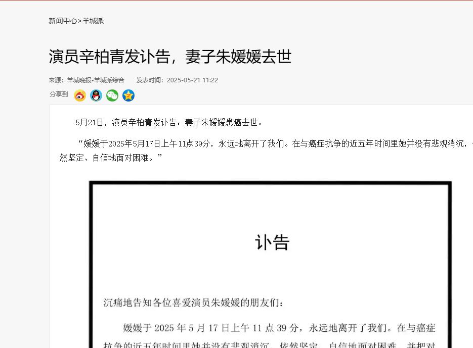2025年,辛柏青的妻子朱媛媛在5月17日去世。