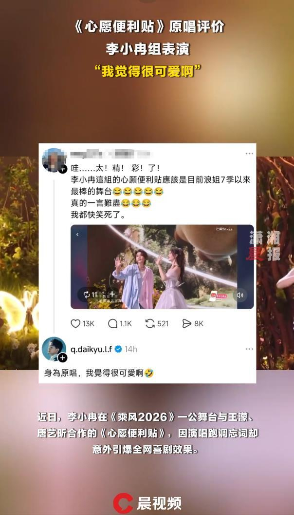 ## 李小冉的"翻车"舞台:当舞台的"不完美"成为最真实的快乐, , 在这个追求完美的时代,舞台上的一次"翻车"却意外地收获了全网的喜剧效果。《乘风2026》舞台上李小冉、王濛、唐艺昕的《心愿便利贴》,以其"真实"的演唱风格,成为近期最具话题性的娱乐事件。, , 这场"翻车"表演的真实性令人惊叹,三位主演坚持全开麦真唱,无垫音保驾,演唱过程中李小冉开口便遇到了天障,声音跑调、破音,唐艺昕在高音部分则如同在赛道上发挥自己的短道速滑实力,王濛的演唱更是被网友调侃为"运动员气势",整段表演被戏称为"摇滚版便利贴",与原版甜蜜轻快的风格形成了史诗级反差。, , 值得一提的是,这场"翻车"表演在网络上引发的讨论远远超出了批评的范围,观众们纷纷表示,这种"笨拙但真诚"的表演方式令人一发不可思议,他们称其为"不假唱、不怯场、不做作、不好听",这种纯粹的综艺效果被比作"史诗级抗抑郁视频",甚至成为了上班族解压的"周一解药"。, , 更有趣的是,这场热闹还收获了原唱的认可,歌曲原唱者吴忠明亲自在社交平台回应道:"身为原唱,我觉得很可爱啊。"这番包容又幽默的点评,不仅为这场"翻车"表演盖上了一层"官方认证",更让人感受到娱乐圈的包容与幽默。, , 这场看似尴尬的表演,最终演变成了全民狂欢的"全员大赢家",它告诉我们,在舞台上,有时候极致的"不完美",反而能碰撞出最真实的快乐火花,正如吴忠明所说,"可爱"的定义,往往就藏在那些看似不完美的表现中。, , 这场"翻车"舞台的成功,道出了娱乐行业最宝贵的品质:真实,它证明了在这个追求完美的时代,正是那些真实的表现,才能最真实地打动人心。
