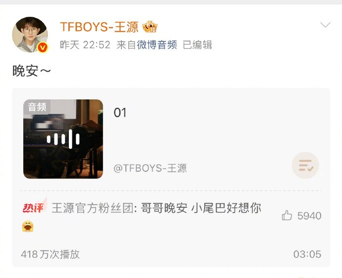 王源近期通过个人微博创新推出语音晚安互动,用温暖的声音分享创作日常与生活感悟,计划在周五至周日的随机晚间空降语音聊天,以声音消除距离感,让粉丝感受到朋友般的陪伴温度。