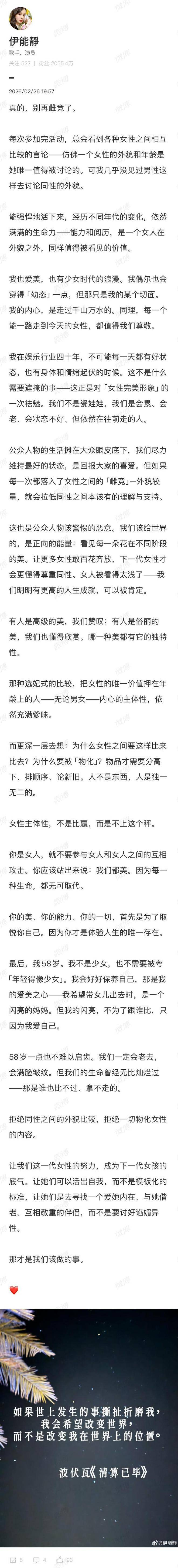 在她最新的博文中,伊能静火力全开,直指女性之间那种选妃式的外貌比较。她深刻分析,这种把女性的价值仅仅捆绑在外貌和年龄上的雌竞行为,本质上是在物化女性,严重扭曲了本该充满理解和支持的女性关系。她举自己为例,坦然表示58岁的自己,根本不觉得有任何难言之隐,自己不是少女,也不需要被夸年轻得像少女。对于她来说,真正重要的不是外表,而是生命力、内在的成长与人生成就,这才是她对自己最看重的价值标准。