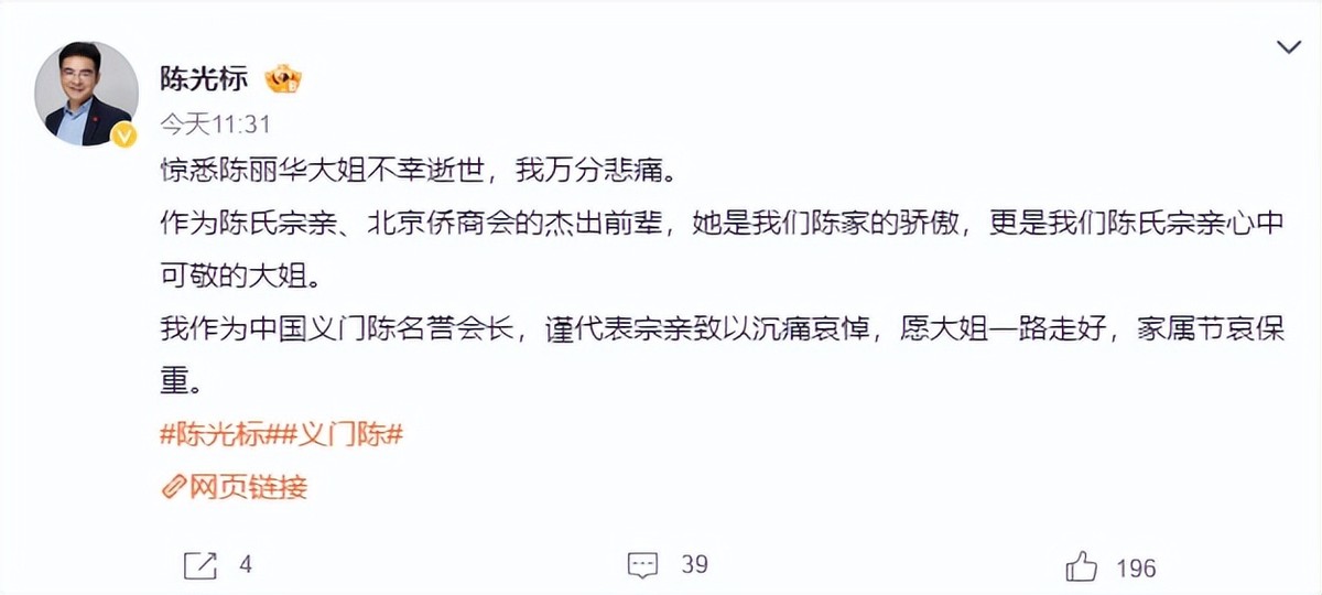 更重要的是,陈光标还有一个身份是 “中国义门陈名誉会长”,他这次出面,也是以这个身份来悼念陈丽华的。