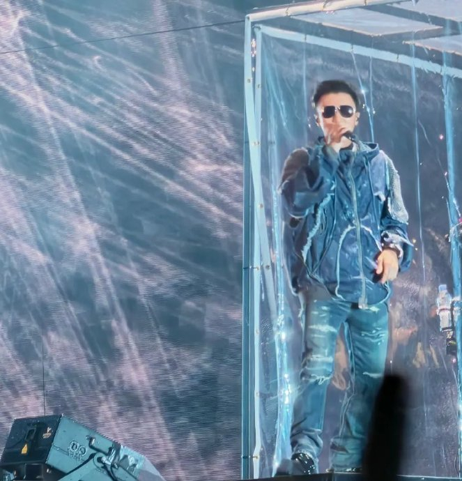 当《不要说谎》的吉他声点燃现场,雨水再度倾盆而下。谢霆锋深V黑T瞬间湿透,却拒绝工作人员递伞,抓过话筒喊道:“大家把雨衣穿好!别感冒!”。三万观众无人离场,蓝色荧光棒在雨幕中汇成星海,合唱声浪压过暴雨轰鸣。章子怡在包厢摘下鸭舌帽起身跟唱,场外粉丝自发加入声浪,形成“3D环绕式”青春共鸣。