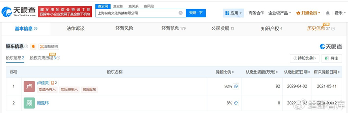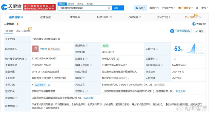 天眼查App显示,主办方关联公司上海粉鹿文化传播有限公司成立于2018年6月,法定代表人为卢佳灵,注册资本100万人民币,经营范围包括文化艺术交流与策划、市场营销策划、企业形象策划等,由卢佳灵、顾旻玮共同持股。
