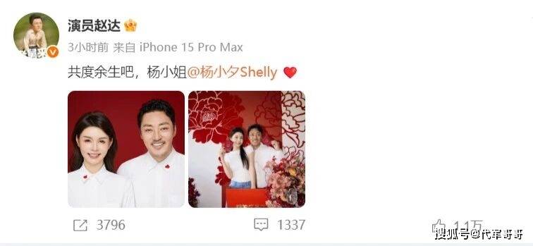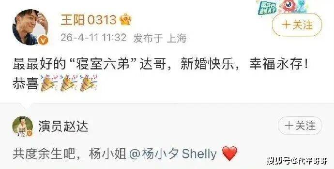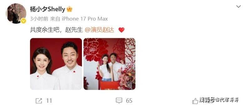 2026年4月11日,46岁实力派演员赵达在微博正式官宣婚讯,引发全网关注。他与新婚妻子杨小夕同步晒出红底结婚证照片,赵达发文“共度余生吧,杨小姐”,杨小夕则默契回应“共度余生吧,赵先生”,简洁真挚的告白尽显内敛浪漫,收获无数网友及圈内好友的祝福。