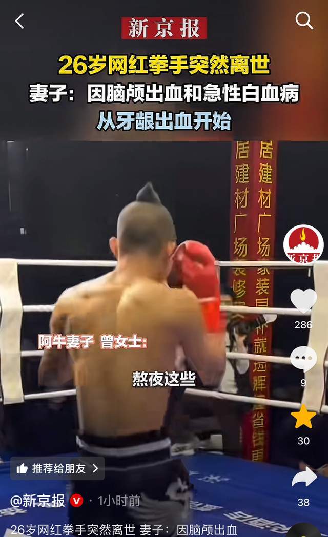 # 26岁就走了,真的是“不该有的悲剧”——云南网红拳手“阿牛”去世,原因竟与熬夜息息相关,云南一位年仅26岁的网红拳击手“阿牛”突然去世,引发了广泛关注,这位从小便痴迷拳击的佤族小伙,居然在短短的职业生涯中就走到了人生的尽头,真是让人唏嘘不已。,阿牛本名田岩映,家在云南临沧孟定,从小就对拳击充满热爱,最终辍学跟随拳击生涯,凭借出色的实力,他在广州的拳击圈里慢慢崭露头角,甚至成为了一名拳击教练,但人生的起伏却让他一家陷入了深深的痛苦。,这位年轻的拳击手留下了一岁多的可爱儿子,据妻子透露,他的去世并非单纯的疾病导致,而是双重因素的结果,阿牛在职业生涯中为了追求“硬拽”的人设,日夜不停地训练和比赛,饮食作息完全不规律,习惯了熬夜,这种不良的生活习惯加上高强度的运动,给他的身体敲响了警钟。,据妻子回忆,阿牛去世前的几天,身体状况已经很不正常,经常高烧、头晕,甚至在休息时嘴角流血,医生诊断出,他是因为长期熬夜导致的血压过高,进而引发脑出血,同时还患有白血病,这两大病魔最终夺去了他的生命。,这位年轻的网红拳击手的悲剧,折射出当下社会中年轻人对拼命追求的“硬核生活”的代价,无论是职业选择还是生活方式,都需要以身体为重,希望更多的年轻人能够学会照顾自己,从熬夜、过度训练中解脱出来,给自己留下一片健康的身体,毕竟,健康才是最珍贵的财富,而身体一旦出问题,再强大的拳击实力也没用了。,阿牛的离去,不仅让家人和粉丝痛不欲生,也让我们看到了生活中那些看似“可以承受”的小习惯,背后可能隐藏着致命的隐患,无论是哪个领域,都要学会正确对待自己,放慢脚步,拥抱健康。