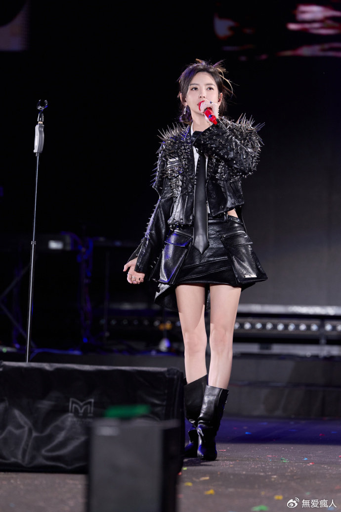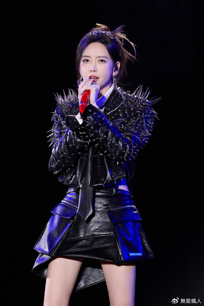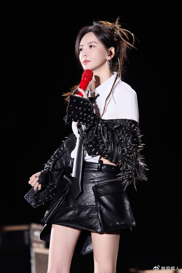这身造型更是将她骨子里的不羁与洒脱展现得淋漓尽致。铆钉皮衣上的尖刺,像是她对世俗的挑战,宣告着自己的与众不同。短裙下露出的修长双腿,在舞台灯光的映照下,散发着自信的光芒。她手持话筒,眼神坚定地望向远方,仿佛在诉说着自己的音乐梦想和对未来的憧憬。