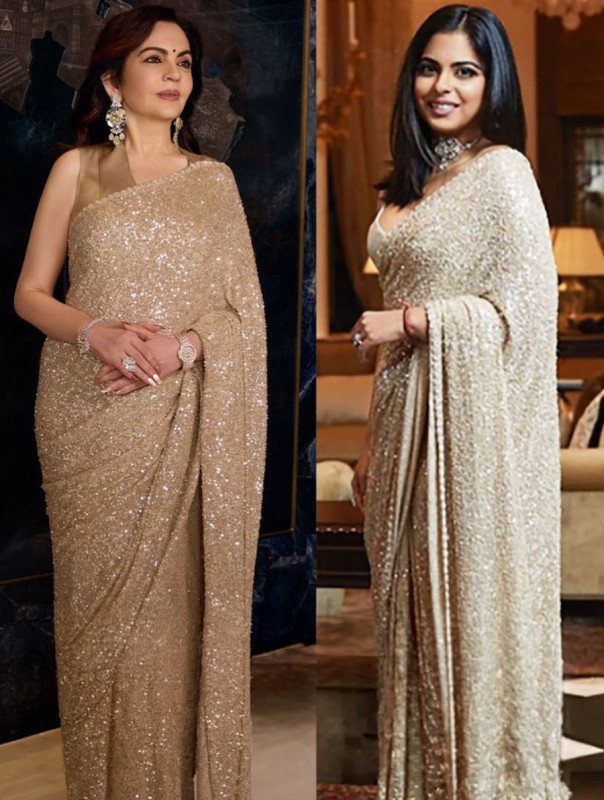 妮塔・安巴尼此次身着的,是印度知名设计师萨比亚萨奇・穆克吉设计的 “阿卡西塔拉” 香槟金纱丽,“阿卡西塔拉” 在印度语中意为星空,纱丽上布满密致的纯手工亮片刺绣,在聚光灯下呈现出如液态金属般的流动光泽,璀璨夺目,宛如繁星点缀,既贴合盛典的隆重氛围,又尽显东方传统服饰的雅致韵味。