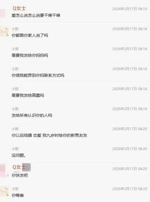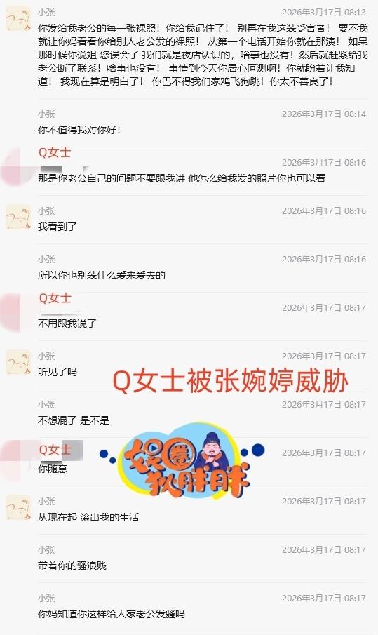 她不仅公开了Q女士的个人信息,还骂她不要脸,发信息威胁要把她的裸照发给她的家人、朋友,甚至点名演员高露,扬言“让你在所有认识的人面前身败名裂”。