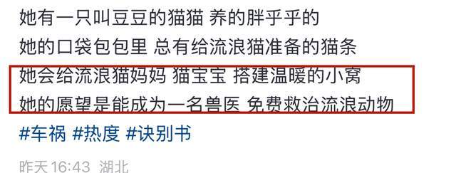 付雪飞闺蜜透露,她外出的时候总会在口袋里放猫条,目的则是喂流浪猫,除此之外,她还会免费给流浪猫搭建温暖的小窝,愿望也是成为一名兽医。