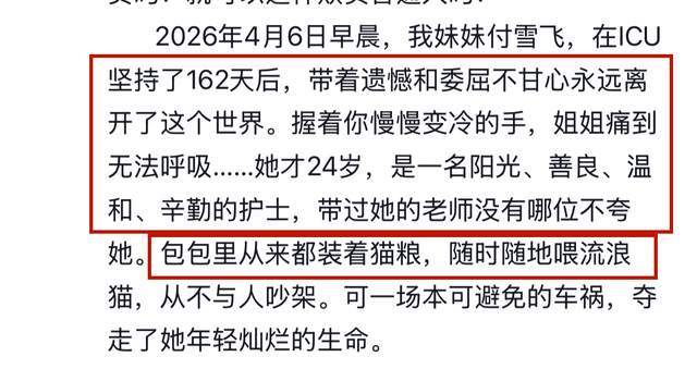 **湖北美女护士付雪飞的离去,令人心碎又惋惜**,一则关于湖北美女护士付雪飞去世的消息让无数网友感伤不已,这位年仅24岁的付雪飞,正值人生的黄金时期,却因为一场意外,永远地离开了我们。,付雪飞是一名扎实的护士,来自湖北,年纪轻轻便展现出了大胆的人生追求,她不仅在医院里默默无闻地为患者治病,还在业余时间里默默关注着社会的每一个弱势群体,她的照片里,总能看到她慈眉善目的笑容,那是一种让人一见倾心的纯真与善良。,命运的安排总是让人哭笑不得,去年7月26日的那个平常一天,付雪飞正与闺蜜们在群聊中欢声笑语,她骑着心爱的电动车,像往常一样穿梭在城市的道路上,但就在这平静的时刻,一场不该发生的车祸突然降临,一个右转弯的小车司机竟在没有减速的情况下,直接撞上了付雪飞的电动车,惨烈的车祸让付雪飞被拖行了将近十多米,最后被送进了ICU。,尽管经历了20分钟的抢救,付雪飞的生命得到了保住,但后续的治疗却并不好转,她在ICU住了整整两个月,期间经历了无数痛苦的日子,在大家的期待之际,她永远地离开了我们。,事情的处理过程也让不少人感到无奈,事故的判责并非一帆风顺,双方的复核导致最终的责任分担同样沉甸甸,这种结果虽然在法律上有其必然性,但无疑让人感到惋惜。,付雪飞的姐姐在接受采访时回忆了妹妹的过去,她说,付雪飞从小就有着强烈的使命感和责任感,无论是照顾病人的时候,还是在业余时间帮助流浪猫,她总是满怀热情,记得有一次,她在医院里发现一只流浪猫,立刻用自己的工资买来了猫粮和一个小窝,默默照顾它,这样的故事让人看到了她善良与责任的双重性格。,更令人扼腕的是,付雪飞的生前还藏着一个不为人知的小秘密,她喜欢在口袋里放着猫粮,路上遇到流浪猫就会把它们领回家,给它们搭建温暖的小窝,她的闺蜜曾经笑着说:“雪飞,你这是在当一位地下兽医啊!”命运的安排让这个美好的愿望永远无法实现。,短暂的生命里,付雪飞用她的爱心和热情,为这个世界留下了太多难忘的记忆,她不仅是护士,是善良的守护者,是一个充满爱的灵魂,她的离去让人不禁想起:如果当时她不那么急着上班,如果当时她能够多注意交通规则,或许她就不会有这样的结局。,人生最怕的,不是未来的黑暗,而是意外的降临,这种无常让人感到无奈,但更让人明白,要珍惜眼前的每一天,珍惜身边的每一个人,付雪飞的故事,让我们看到一个真理:无论多么努力、多么优秀,生命终究是脆弱的,而当我们失去亲人时,最大的痛苦或许不是他们的离去,而是他们未完成的愿望。,在她的墓前,我们可以看到她最后一张微笑的照片,照片里的她,依然是那么美丽,那么充满希望,或许,这就是她留给我们最好的礼物:在悲伤中让我们记住善良,在离别中让我们珍惜生活,付雪飞的离去,不仅让我们失去了一个美丽的灵魂,更让我们明白:生命的价值,不在于它的长短,而在于它的光芒。