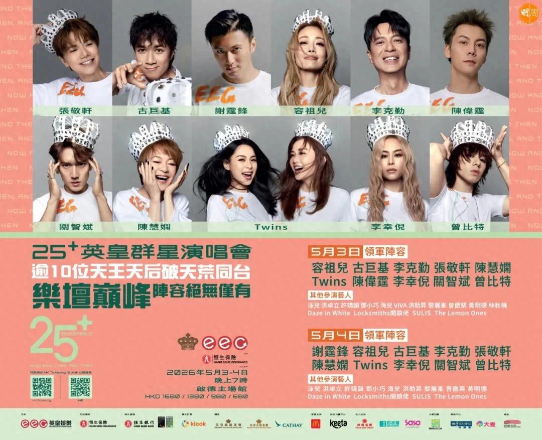 《25+ 英皇群星演唱会》将于 5 月 3 日及 4 日在启德主场馆举办,继此前公布 5 月 4 日的表演艺人阵容后,主办方今日再度公布 5 月 3 日的演出名单,包括容祖儿、古巨基、李克勤、张敬轩、陈慧娴、Twins、陈伟霆、李幸倪、关智斌、曾比特等艺人。