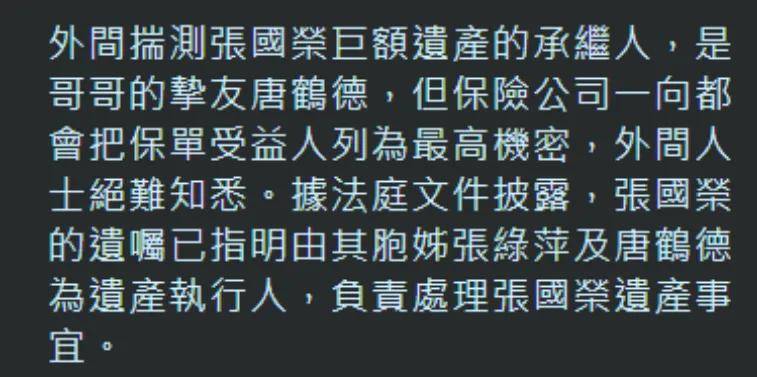 法律文件显示,张国荣姐姐张绿萍和唐鹤德同为张国荣遗产执行人,张绿萍是张国荣的大姐,二人生前关系亲密,继承张国荣八千万遗产的两个外甥女,就是张绿萍所生,之所以给外甥女更多遗产,是因为张国荣考虑到二人需要读书。