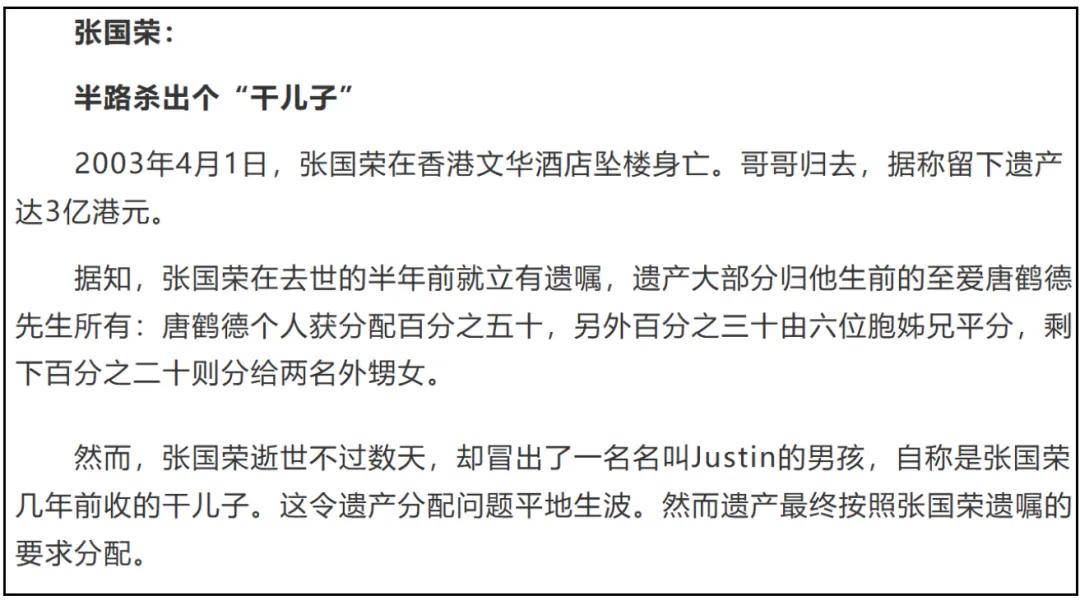 张国荣去世之后不久,就被港媒曝光了遗产分配,据说是张国荣家人透露的,金额并不一定完全准确,但继承比例大致没有问题,二十多年了,不管是张国荣家人还是爱人唐鹤德,都没有出面否认过遗产分配传闻。