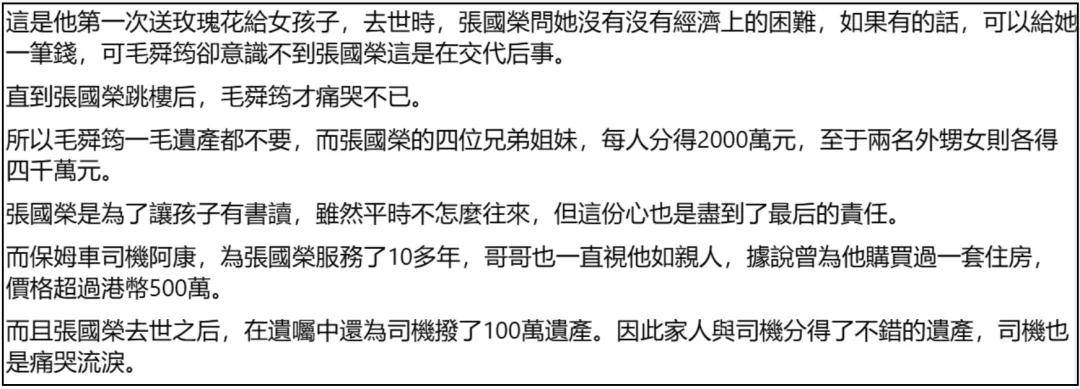 除了亲人和爱人,张国荣还考虑到了前女友毛舜筠,不忘问她缺不缺钱,又给司机留了一百万,免得他失业后不好讨生活。