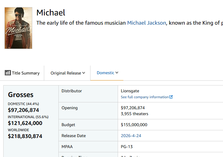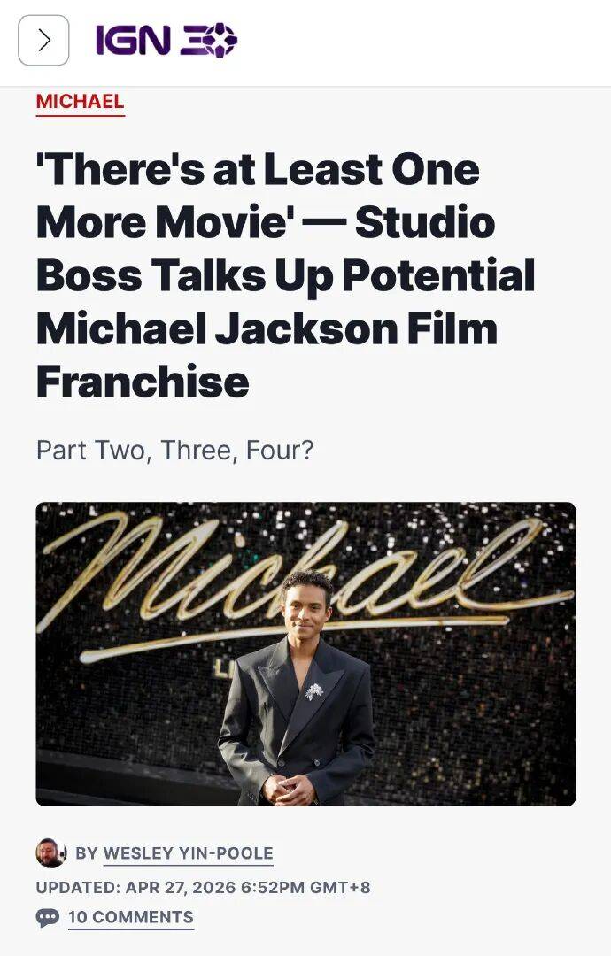 2026年4月26日,CinemaCon展会期间,狮门影业电影集团主席亚当・福格尔公开表态:“《迈克尔·杰克逊》电影至少还有一部,甚至更多”。