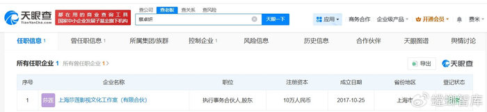 天眼查App显示,蔡卓妍名下关联1家企业,为上海莎莲影视文化工作室(有限合伙),蔡卓妍在该工作室担任执行事务合伙人。值得一提的是,蔡卓妍与林俊贤无直接商业关联。