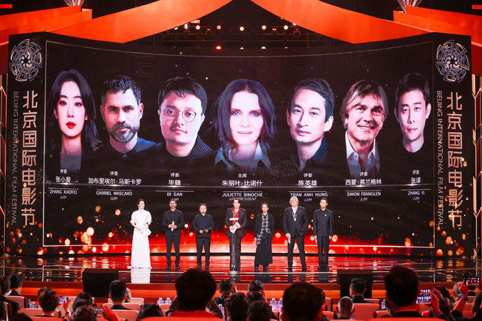 ↑4月25日,第十六届北京国际电影节“天坛奖”国际评委会主席朱丽叶·比诺什(左四)和评委毕赣(左三)、陈英雄(右三)、加布里埃尔·马斯卡罗(左二)、西蒙·弗兰格林(右二)、张小斐(左一)、张译(右一)在闭幕式现场。
