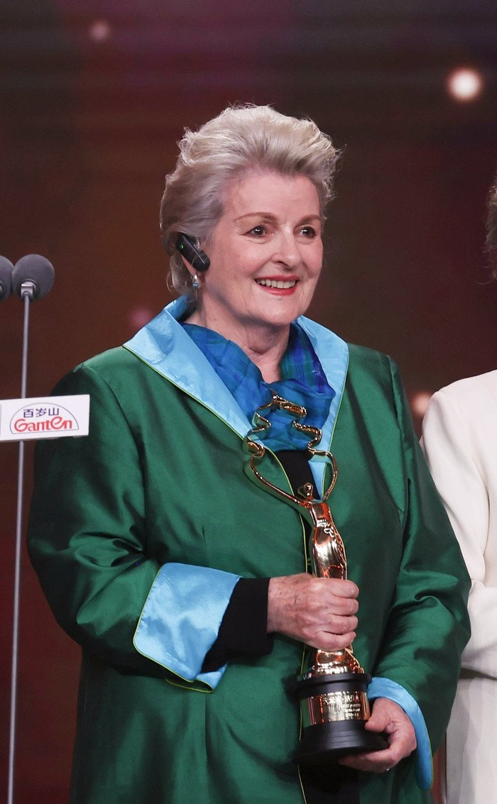 ↑4月25日,两位女演员安德丽娅·赖斯伯勒和布兰达·布莱斯凭借电影《危情蜻蜓》一起获得最佳女主角。图为演员布兰达·布莱斯上台领奖。