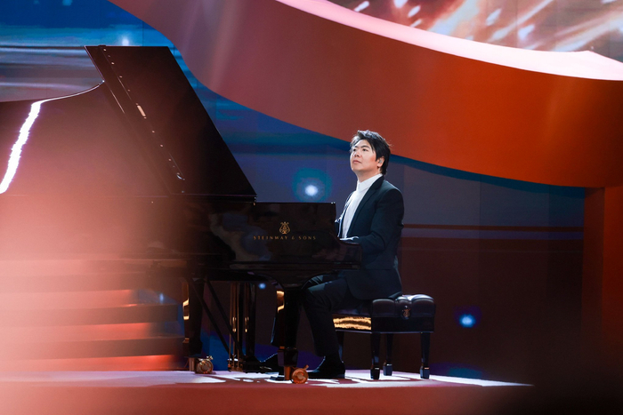 ↑4月25日,钢琴家郎朗在闭幕式上弹奏钢琴。