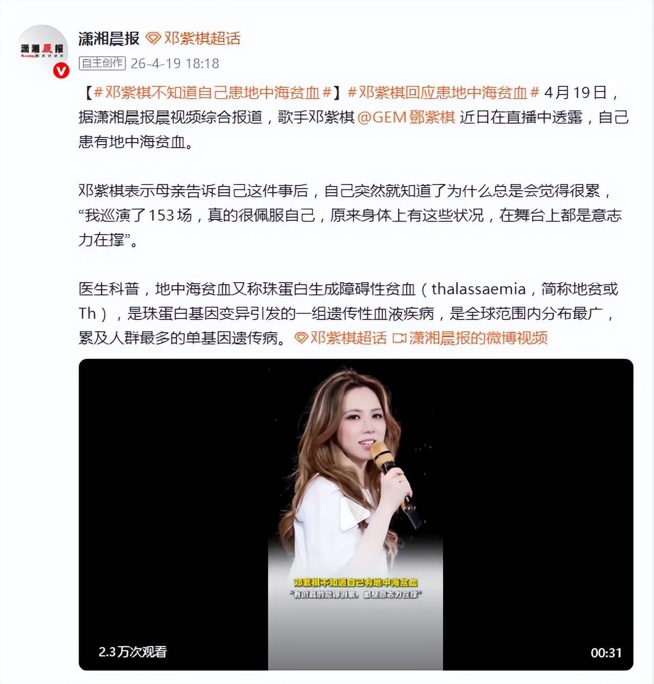 ## 邓紫棋地中海贫血自曝:153场巡演背后的"身体艺术家"惊人毅力, , 在4月19日的直播中,邓紫棋用一声"我不知道自己有地中海贫血"的惊人自白,让粉丝们瞬间破防,这位"偶像"的坦诚,犹如一记重锤,撕开了明星光环背后的健康隐患。, , 这场直播,不仅仅是邓紫棋向粉丝们坦白健康状况的场景,更是一场关于身体与意志的深度对话,当她说出"巡演了153场,真的很佩服自己,原来身体上有这些状况,在舞台上都是意志力在撑"时,听众们不禁为之动容,邓紫棋的这段话,仿佛在向世界展示了一张真实的身体画像,而这张画像上,不仅有着惊人的职业精神,更有着与生俱来的身体条件。, , 粉丝们纷纷留言,称赞邓紫棋是"用意志力创造巡演奇迹"的"身体艺术家",这些粉丝们的关心与支持,恰恰展现了明星与粉丝之间那份特殊的情感纽带,但更让人深思的是,不少患有地中海贫血的网友也纷纷站出来,他们用自己的经历告诉邓紫棋:"别担心,我们日常也能过得很好。"这番话,不仅温暖,也带着一丝无奈,地中海贫血虽不严重,但对于一个需要频繁出场的演员来说,确实需要特别的注意。, , 地中海贫血,又称珠蛋白生成障碍性贫血,是一组遗传性血液疾病,这种疾病源于珠蛋白基因的变异,会导致红细胞无法正常生成,虽然日常生活中并不致命,但对于需要精力充沛的职业人士来说,确实需要特别注意身体状况,邓紫棋的坦白,让这群患者感到被理解和支持,也让更多人开始关注这并不罕见的疾病。, , 邓紫棋的坦诚,不仅仅是一次健康告知,更是一次职业生涯的告别仪式,在舞台上,她用自己的身体演绎着一场惊心动魄的"身体艺术",153场巡演的背后,是无数个不眠之夜,是无数场精准的舞台表演,这些,都是邓紫棋用自己的身体力行诠释的"职业荣誉"。, , 这场直播,让我们看到了明星背后的真实,邓紫棋用自己的方式向大家展示了什么是职业精神,什么是坚持不懈,她的坦白,不仅让粉丝们感动,也让我们看到了明星在面对身体困扰时的坚韧,邓紫棋的榜样作用,不仅仅是因为她是业内的佼佼者,更因为她用自己的经历告诉我们:生命中的困难,并不可怕,可怕的是对困难的逃避。, , 在这个追求完美的时代,邓紫棋的坦白给我们带来了一个重要的启示:健康才是最重要的财富,无论是明星还是普通人,都不应该忽视身体的呐喊,邓紫棋的直播,不仅是一场关于身体的对话,更是一场关于生命的启示,让我们记住:真正的坚强,不是无视身体的疼痛,而是学会倾听身体的呼唤,给予它必要的关怀与呵护。