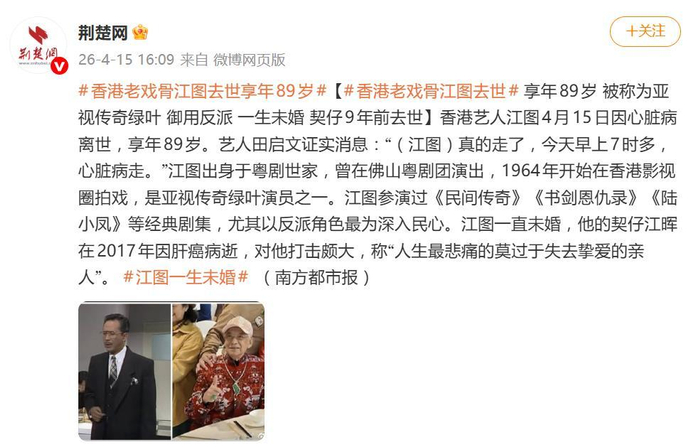 **吃瓜简评:江图去世,香港影视圈少了一道熟悉的“绿叶”**,啊,又一枚“绿叶”悄悄凋零了!香港老戏骨江图(原名蔡志祥)在4月15日早上因心脏病不幸离世,享年89岁,消息由田启文亲自对外公布,一句“真的走了”,为这位横跨粤剧、电影和电视圈数十载的老艺人画上了句点,这位“熟面孔”走了,唉,真是让人唏嘘啊!,说到江图,这名字在香港影视圈可不是个小人物,1936年出生的他,生于一个真正名副其实的粤剧世家,他的母亲冯侠华是当年的粤剧女须生,曾与任剑辉同台;舅父冯侠魂是文武生,舅母楚岫云更是粤剧界的大名伶,家学渊源深厚,19岁便随舅父去内地演出,后来在佛山粤剧团练就一身扎实的功底,可当他到香港时,已经是“江涛”了,后改名为“江图”,寓意“大展宏图”。,1964年,江图正式开启了他的电影生涯,出演了《香港屋檐下》《金面侠》等经典作品,不过他真正的黄金时代是在电视圈,尤其是在亚视的几十年里,他出演了无数经典剧集,大地恩情》《大侠霍元甲》《我和僵尸有个约会》《民间传奇》《书剑恩仇录》《陆小凤》等等,无论是塑造反派角色还是正面角色,江图都能游刃有余,演技稳扎稳打,是业界公认的“甘草演员”。,但话说到这里,你们可别以为江图这辈子光是为了表演而活的,说到他的个人生活,他一生未婚,这点可真是让人唏嘘,更让人心疼的是,2017年,他的契仔江晖因肝癌去世,江图曾说“人生最悲痛的莫过于失去挚爱的亲人”,这段经历对他打击得极为沉重,尽管如此,他依然挺身而出,在2019年客串电影《叔·叔》,饰演“超仔”一角,演出细腻自然,成为他的银幕遗作。,说到江图,真想为他为他骄傲!从粤剧舞台到影视荧幕,从翩翩少年到耄耋老者,他用一生诠释了什么是忠诚与担当,他虽然未婚,但他用演艺的热情和努力,填补了所有的空虚,香港影视圈少了他,真的是少了一道熟悉的“绿叶”,那片他曾经活跃的“香港屋檐下”,自此少了一道身影。,江图的离去,不仅是香港影视圈的集体记忆的封存,更是对一代观众情感的告别,虽然他已不在人世,但他的作品和精神依然在我们心中生根发芽,继续发芽,老戏骨江图,真的是一颗闪耀的星,永远值得我们铭记。