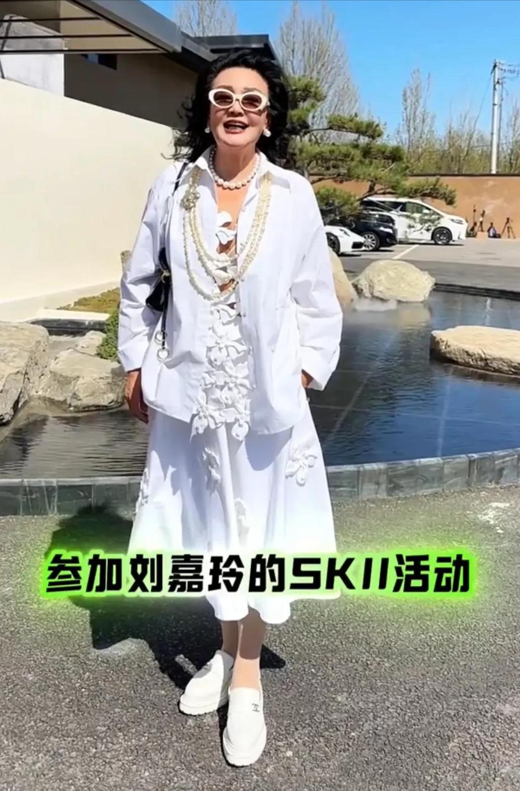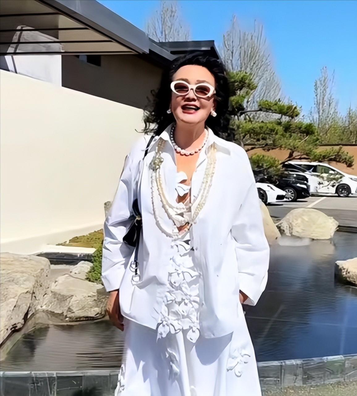 张兰也穿白,一整套很讲究,连耳环和眼镜都往“同色系”靠,干净、克制、还挺会。