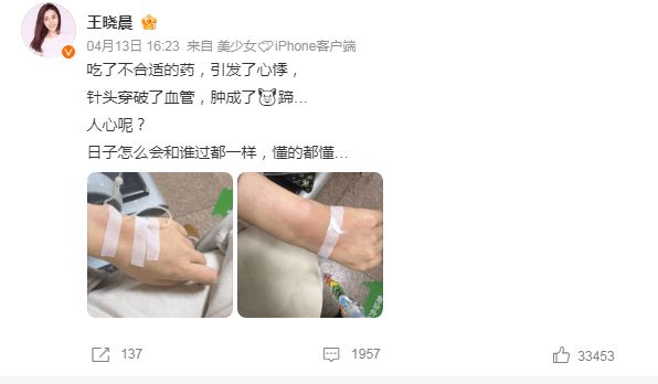 王晓晨今日(4月13日)发文称因误服药物引发心悸,就医输液时又遇针头穿破血管导致手臂肿胀,配文"人心呢?日子怎么会和谁过都一样,懂的都懂"引发网友对其与俞灏明感情状态的猜测。