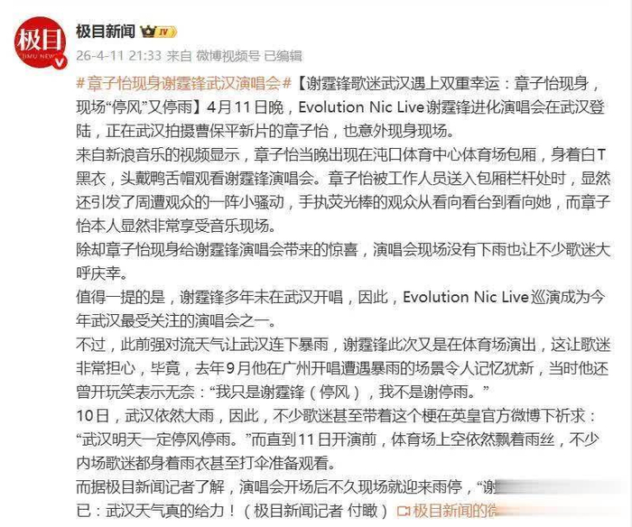 **武汉演唱会:谢霆锋与章子怡的“双本命”偶遇,天气也太给力了吧!**,武汉的夜空中,星光与谢霆锋的演唱会合力灯光了一把,创造了一场“双本命”级的偶遇!这场演唱会不仅因为谢霆锋的实力火爆,还是因为台下偶然现身的章子怡,让现场气氛瞬间升温,堪称“门票圆梦”!,从视频来看,章子怡的造型简约又高级,鸭舌帽配休闲装,低调中透着星光,她的出现瞬间就引发了现场一阵小小的“风波”,周围的谢霆锋迷们纷纷从舞台转移目光,连忙拿出手机疯狂拍摄这场偶遇,更有趣的是,章子怡本人对音乐的热爱也被拍到了,她全程专注观看,随着谢霆锋的旋律自然起舞,认出后还亲切挥手微笑,气场满满。,这场同框被粉丝们直呼是“双本命相遇”,一边是台上深情演唱的偶像萌,另一边是台下沉浸在音乐中的影星巨星,简直就是“天作之美”,这场演唱会的彩蛋效应太操控了,直接把“谢霆锋的兵”们的血压提升了几分。,而演唱会的其他亮点更是让人捧腹,谢霆锋多年未在武汉开唱,这次体育场巡演可是当地的“必看”演唱会,但开唱前,武汉的天气也太会配合了,强对流天气让人捏了一把汗,毕竟去年广州演唱会都曾遭遇暴雨,谢霆锋还曾自嘲“谢停雨”,不过这次武汉的天气果然是“给力”的,开演前不久,雨也停了,现场气氛瞬间转变,谢霆锋的“兵”们纷纷感叹:“武汉天气这次是真的太给力了!”,这场演唱会不仅是谢霆锋武汉粉丝的狂欢,也因为章子怡的意外现身和完美天气,成为了这段时间来最值得一看的娱乐新闻,无论是谢霆锋的演唱,还是章子怡的“彩蛋”,都让人忍不住感叹:这场演唱会,简直就是“一张门票圆梦两人”。