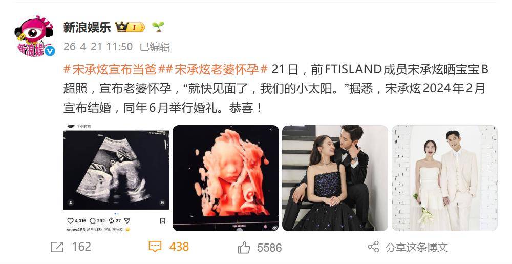 恭喜!4月21日,前FTISLAND吉他手宋承炫在社交平台晒出宝宝的B超照,并深情配文:“就快见面了,我们的小太阳。”从黑白影像到3D彩超,小家伙的脸部轮廓清晰可见,画面温馨,瞬间引爆了粉丝圈的祝福与对一代人青春回忆的感慨。