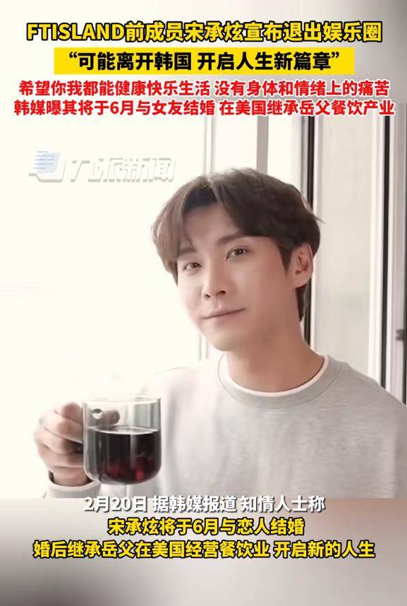 2019年,宋承炫退出效力十年的乐队FTISLAND,转而挑战戏剧圈。然而,四年演员生涯并未能打开新局面。2024年2月,他做出了一个更彻底的决定:正式宣布退出韩国演艺圈,并同时公开了与交往多年的圈外女友的婚讯。当时有台媒报道称,他退圈是为爱隐退,并计划赴美接手女方家族的餐饮事业,但宋承炫本人对此予以否认,仅表示“会幸福地生活下去”。